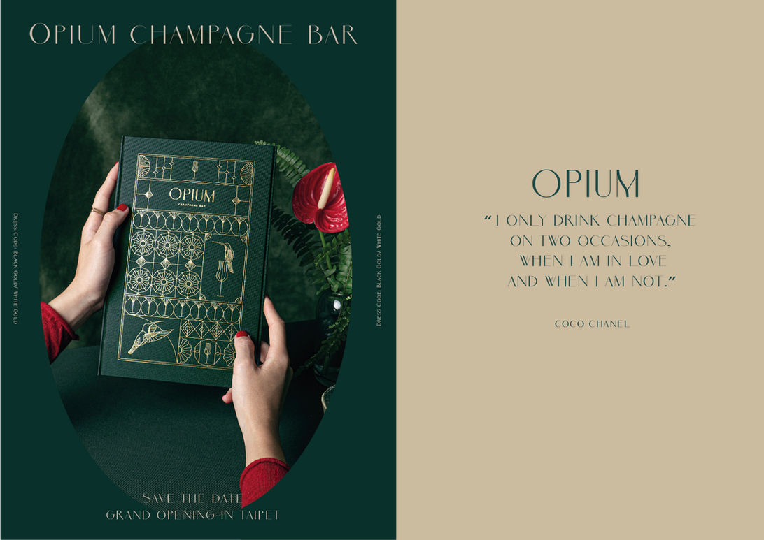 OPIUM是一家為都會女性打造的時尚的香檳吧,位於繁盛的台北101旁,希望在壓力爆炸的時代女性也能有一個能夠寵愛自己的空間,從裝潢到佈置的細節,處處充滿優雅與對女性的體貼。以濃厚的法式古典風情為空間概念,採用大片落地窗搭配挑高空間和高掛絢爛的水晶燈,適合與閨蜜一起小酌暢談或獨自和香檳來一場浪漫邂逅。
